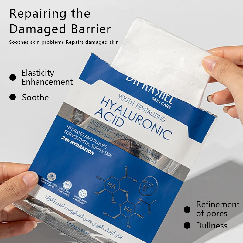 آبرسانی عمیق و فوری با هیالورونیک اسید خالص تغذیهکننده و نرمکننده پوست بدون احساس چسبندگی یا چربی کاهش خشکی، زبری و کدری پوست با اولین بار استفاده ماسک دو لایه با لایه ابریشمی برای جذب بهتر و پوشش کامل صورت
